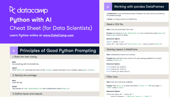 All session invites have been emailed to you and cheat sheets are available below. To start building true job-ready skills, explore DataCamp's Python x AI curriculum below.